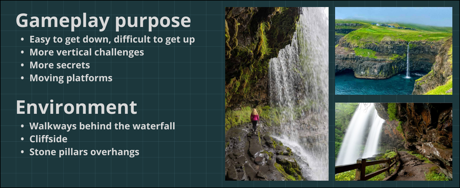 We planned to have gameplay behind the waterfall, but this was later moved into the cave behind it, to allow us to expand it into the mountain.